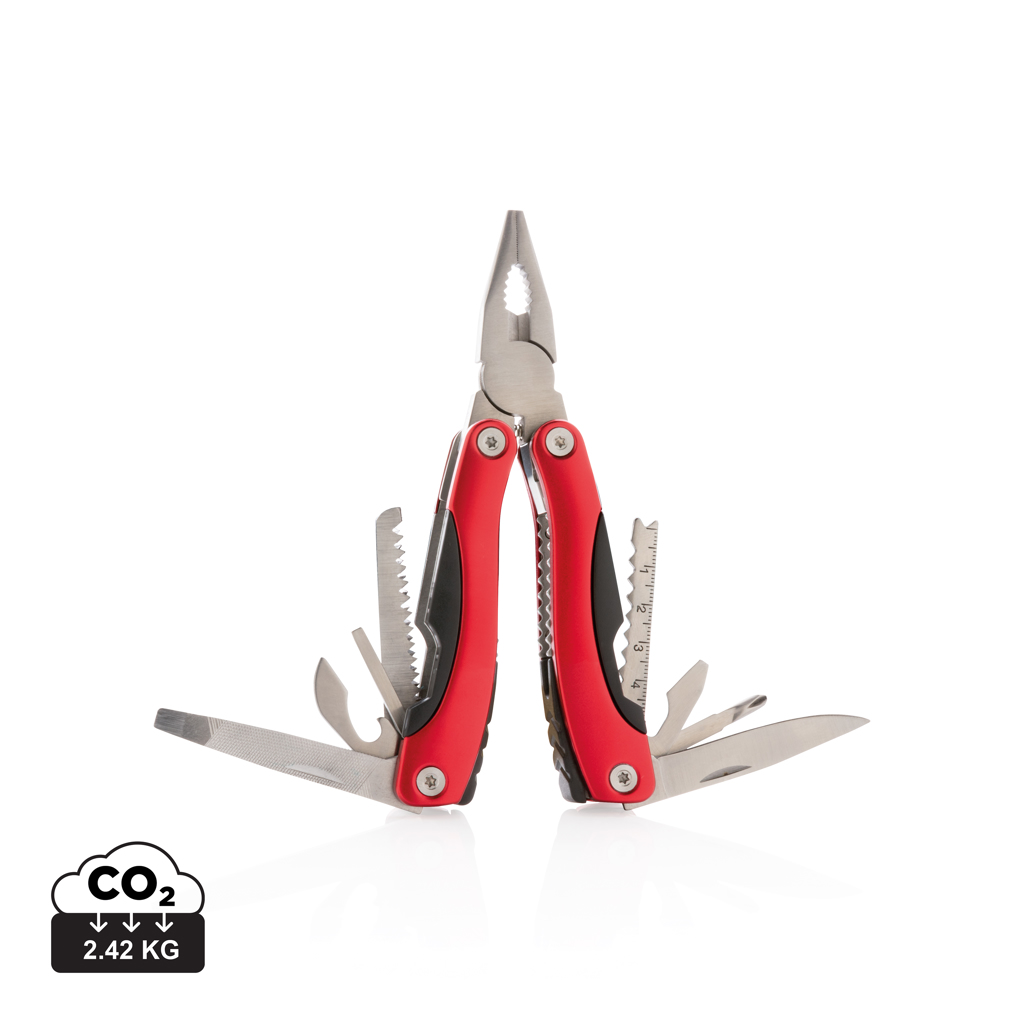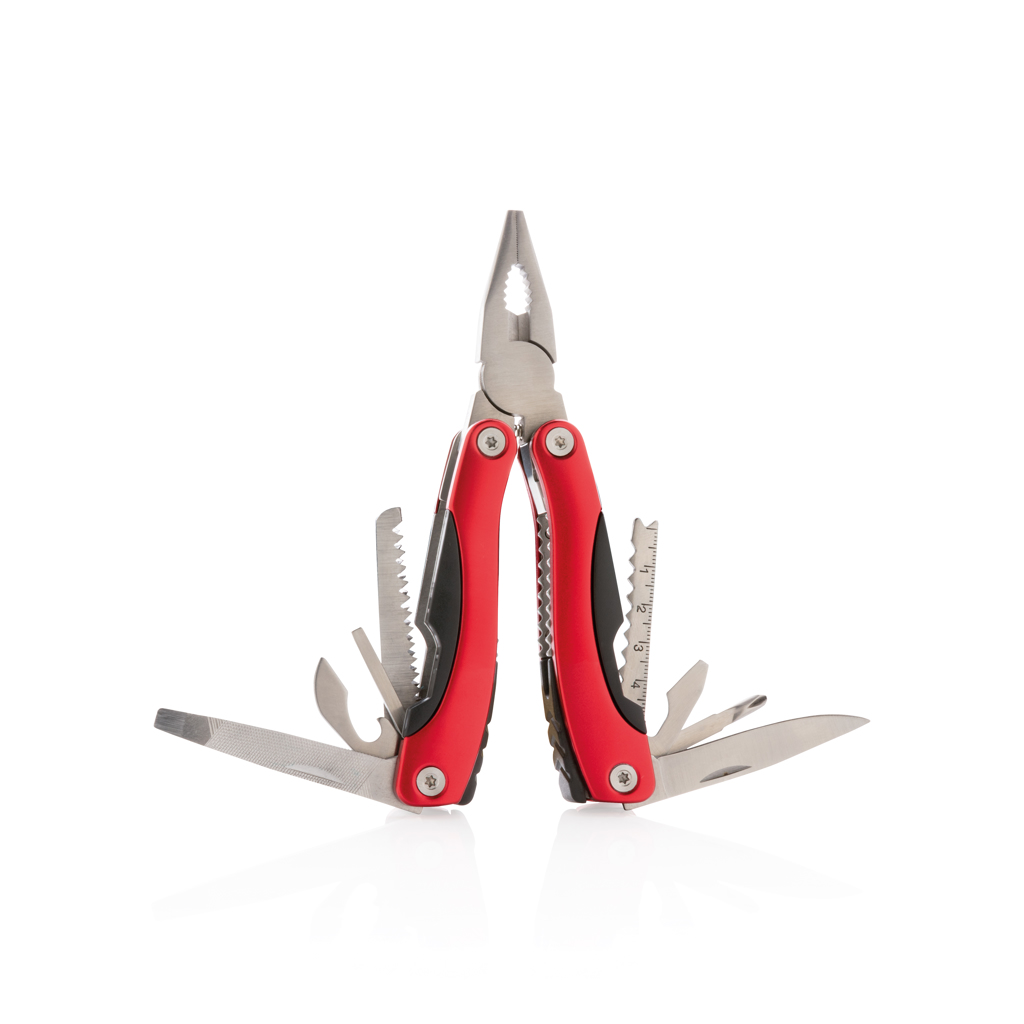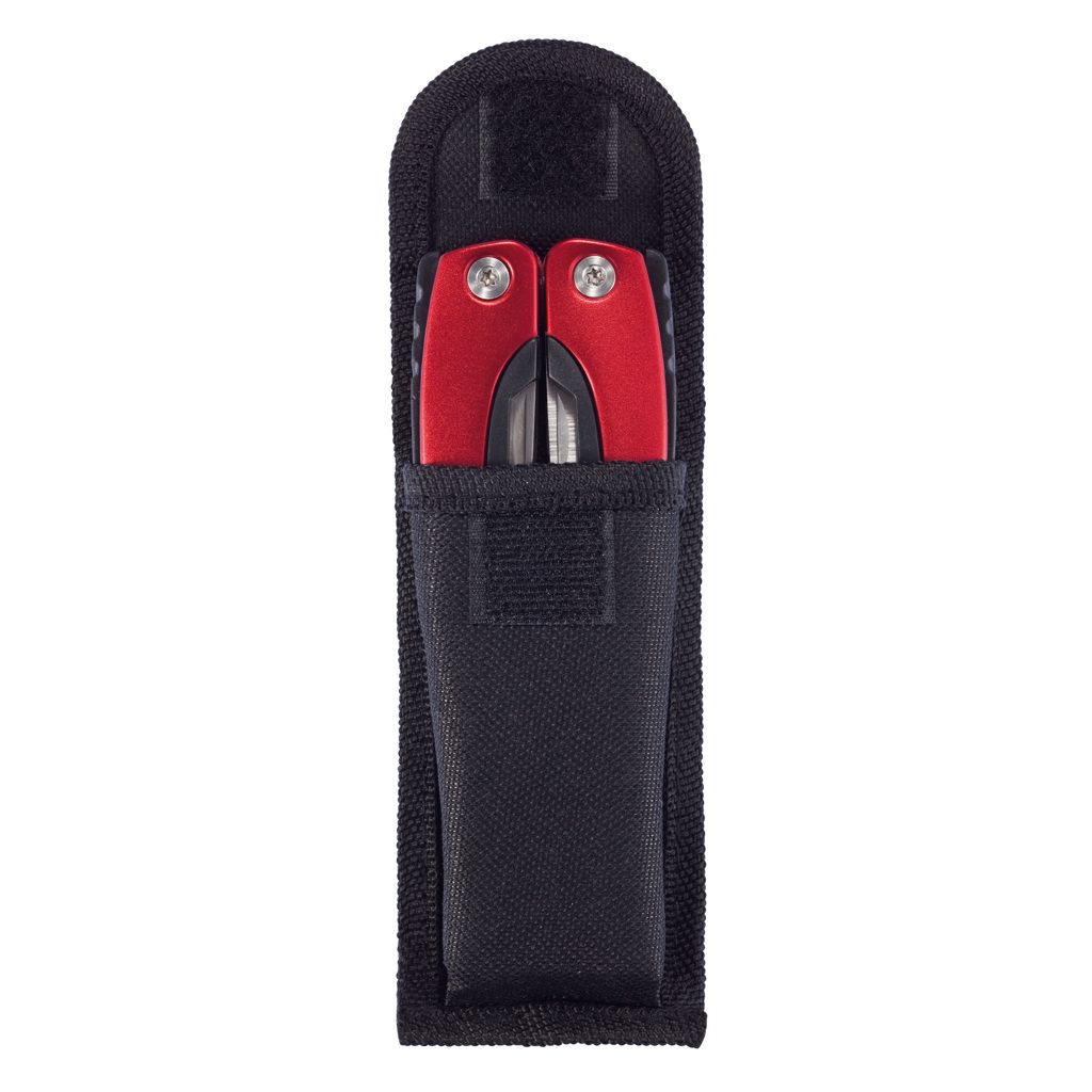 Hliníkový multifunkční nůž, rukojeť s černými detaily, 14 funkcí, uložený v černém pouzdru 600D.