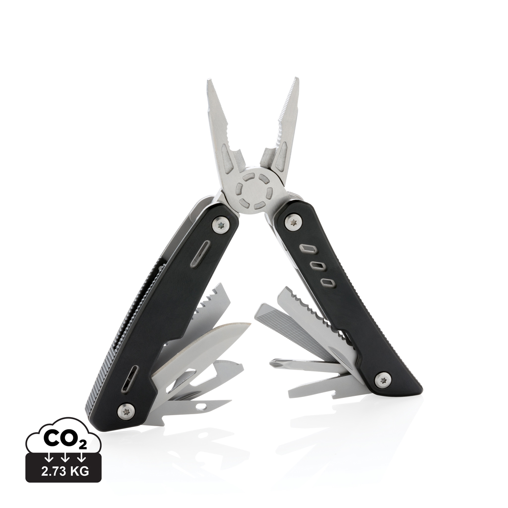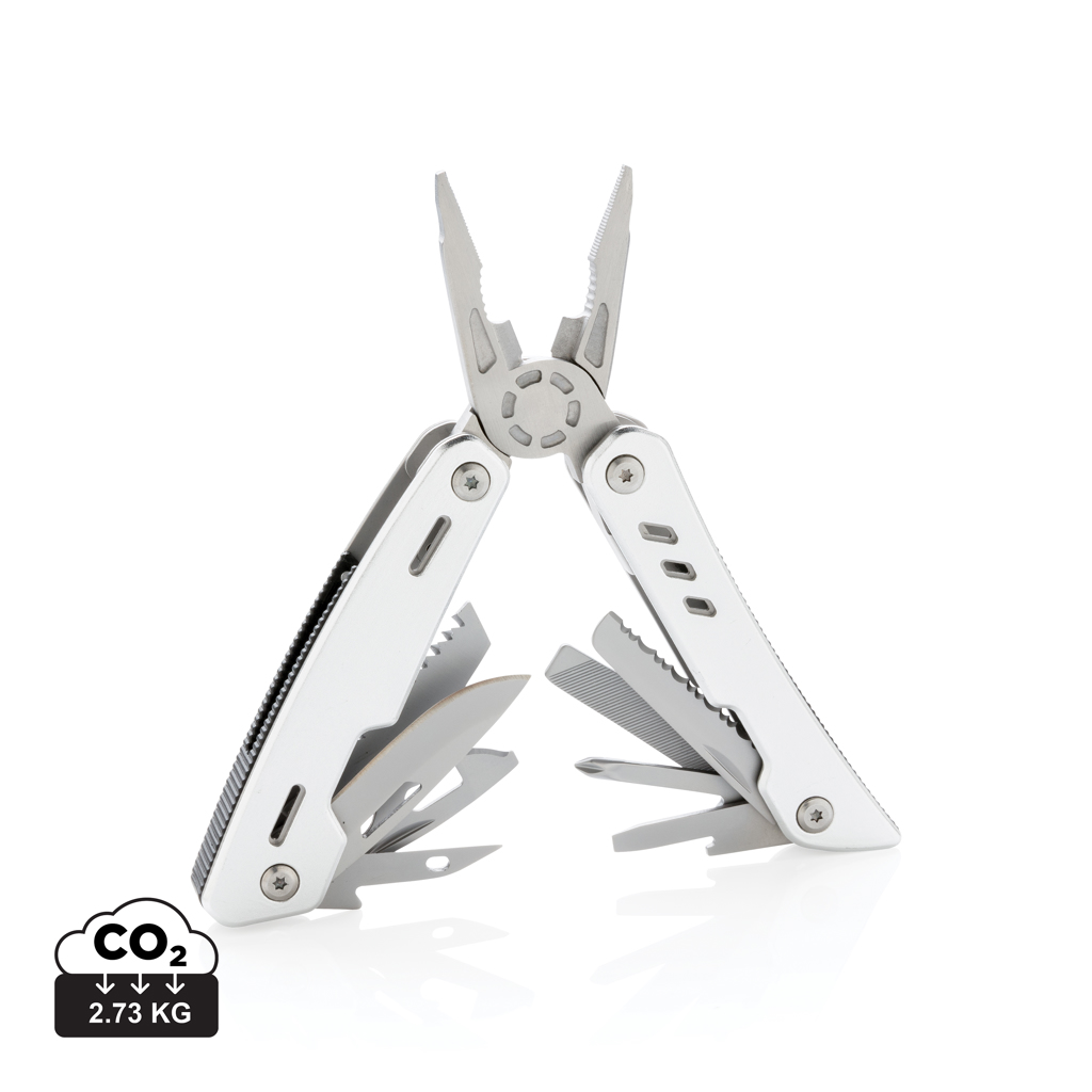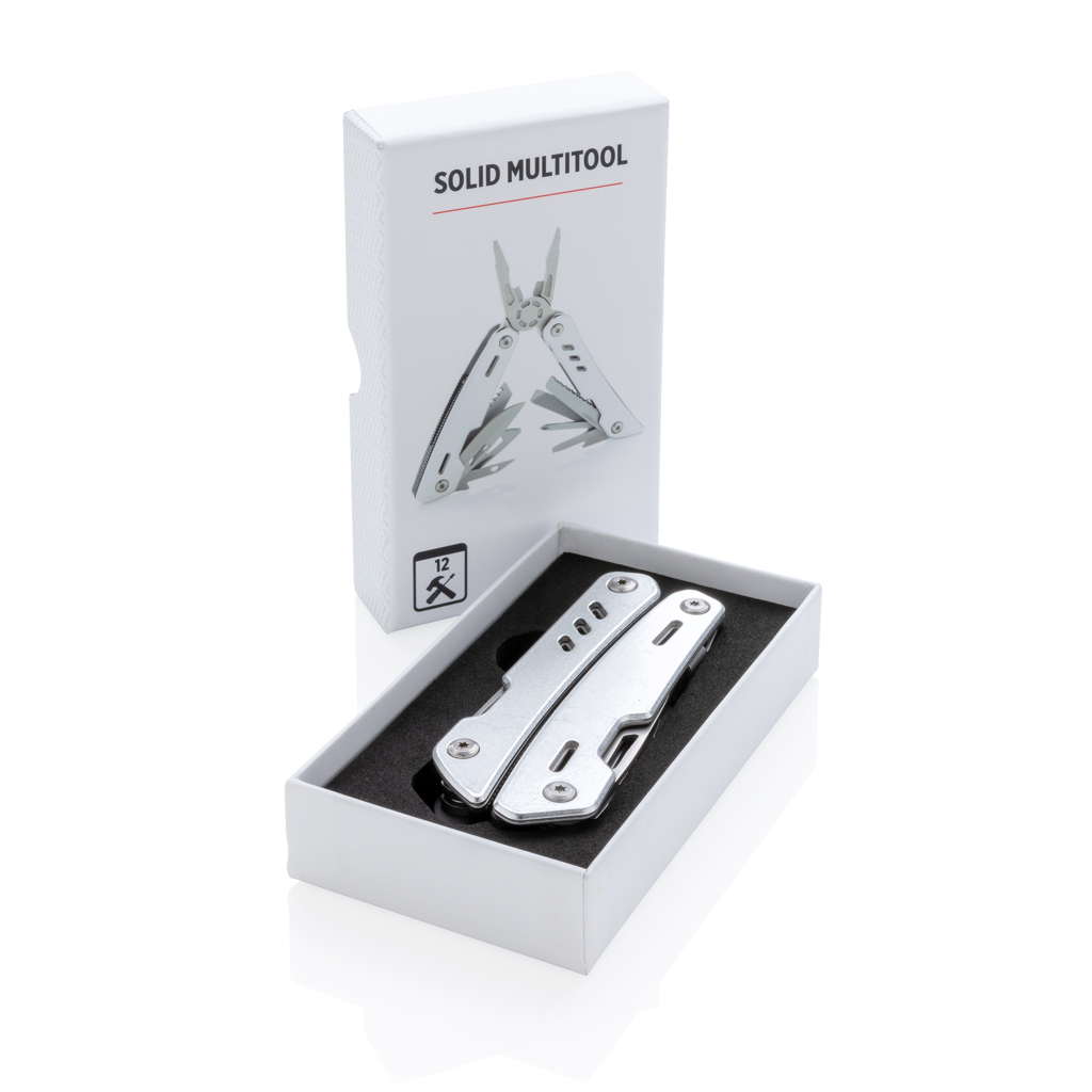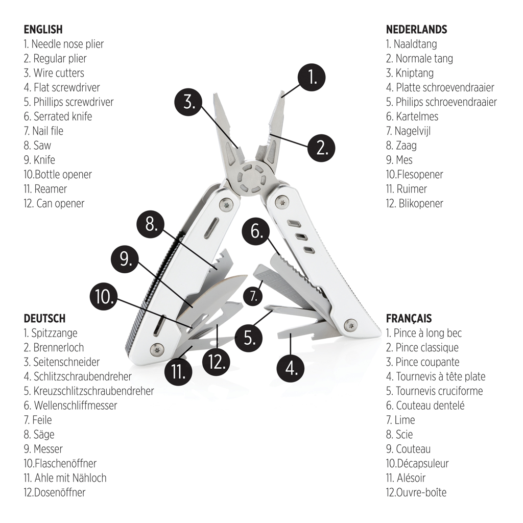 Kvalitní odolný multifunkční nůž s 12 funkcemi: kleště s jehlovou špičkou, utahovací kleště, štípací kleště, nůž s rovným ostřím, nůž se zubatým ostřím, křížový šroubovák, malý plochý šroubovák, pilka, otvírák plechovek a lahví, výstružník/šídlo, pilník/velký plochý šroubovák. Tělo z hliníku, nástroje z nerezové oceli. Baleno v dárkové krabičce.