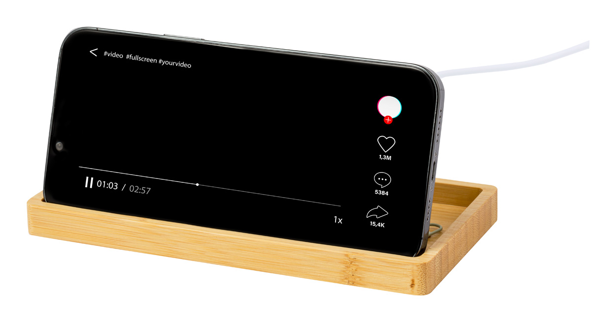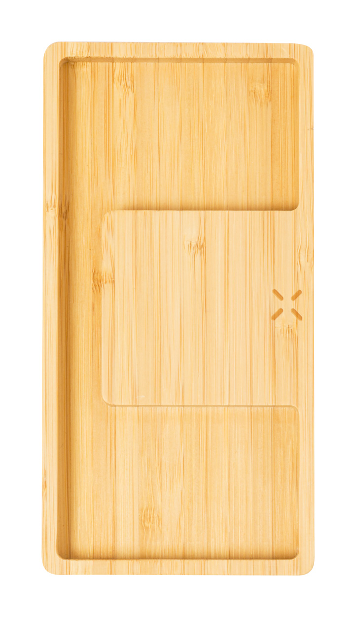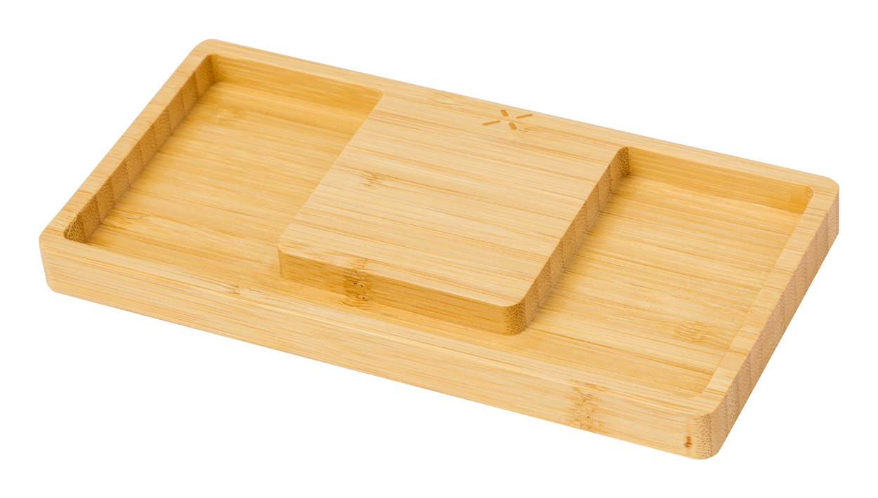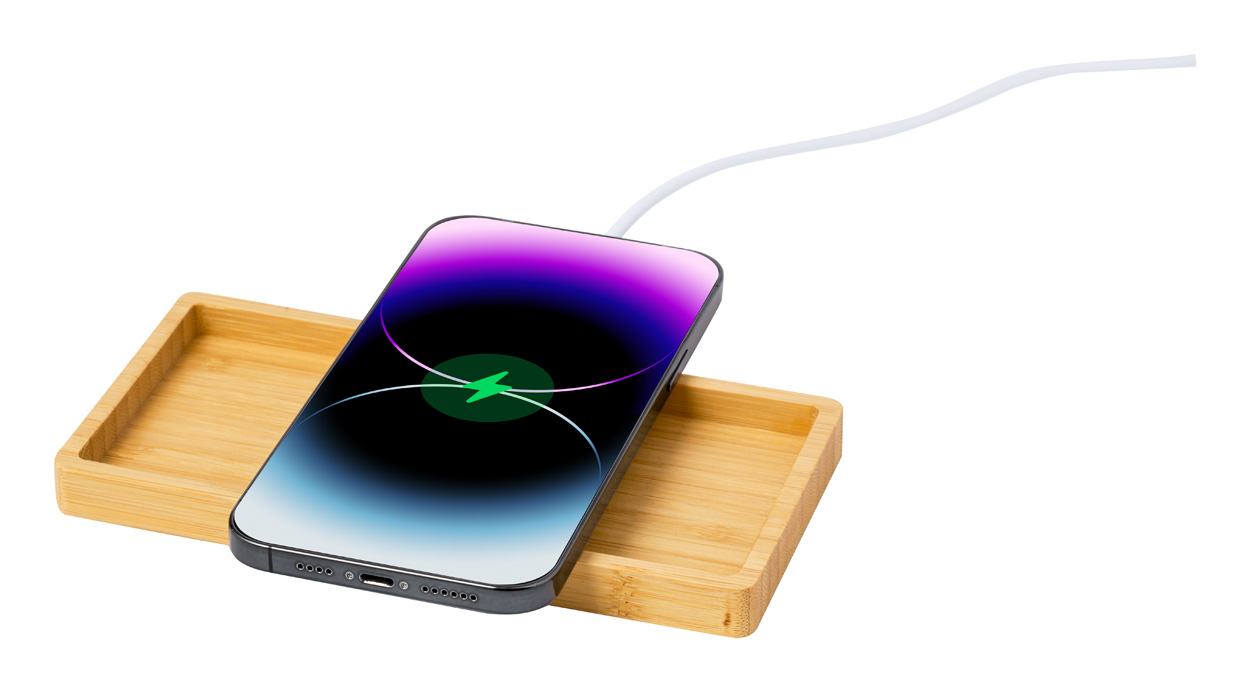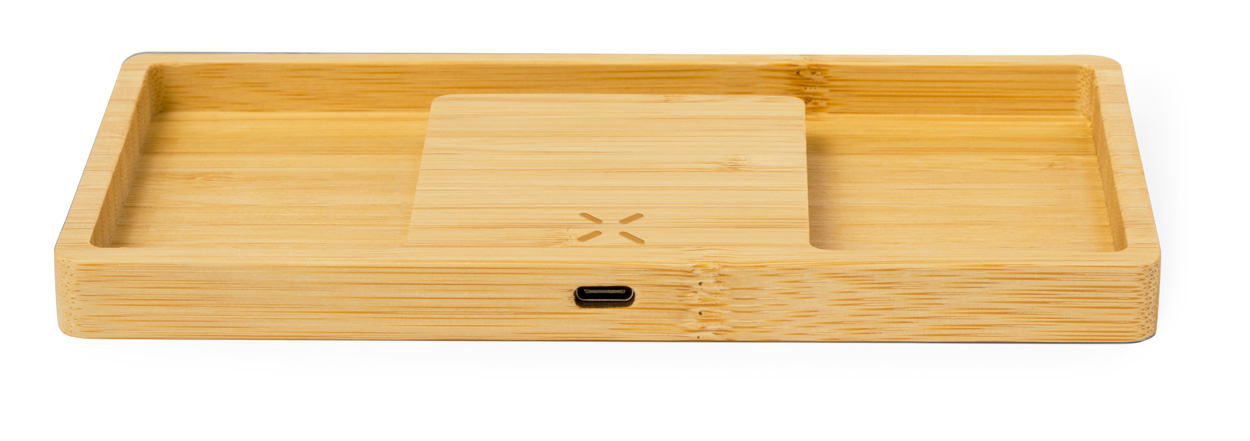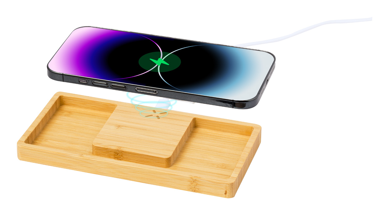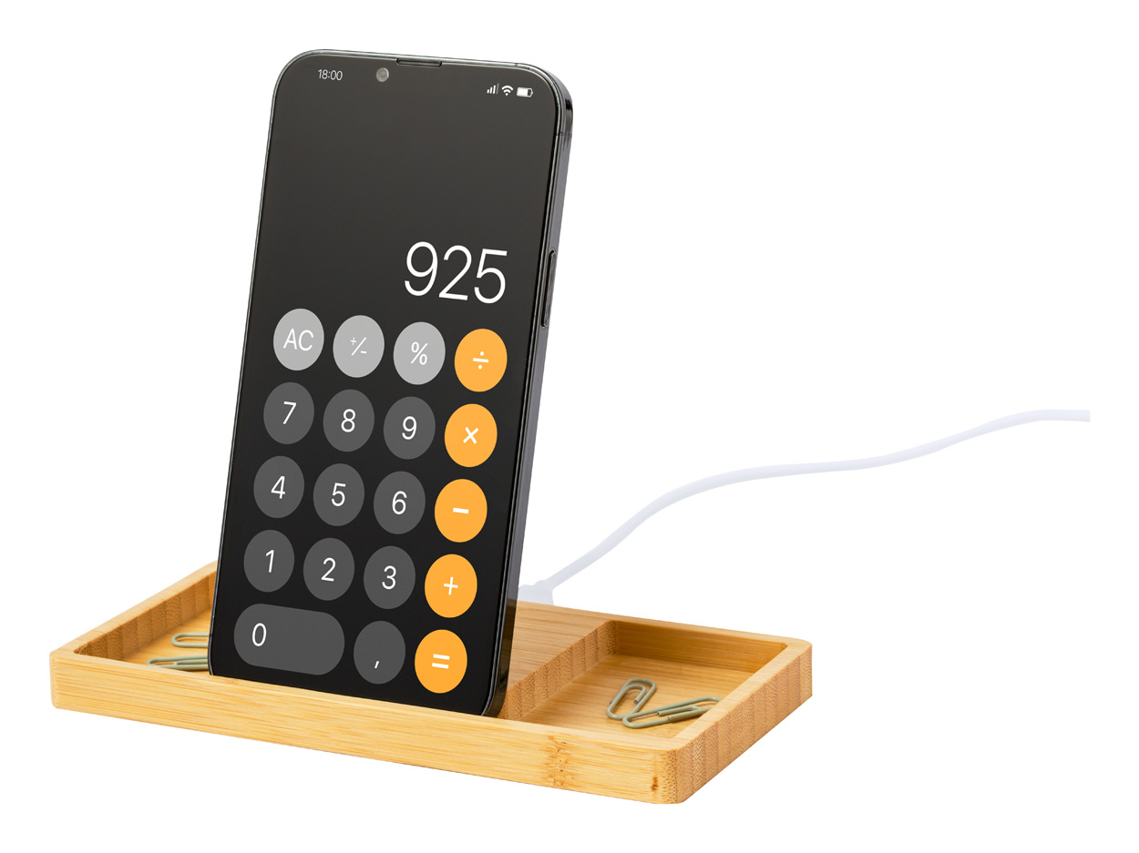 Bambusový stolní organizér a držák na mobilní telefon s vestavěnou bezdrátovou rychlonabíječkou (15W). Včetně USB nabíjecího kabelu.