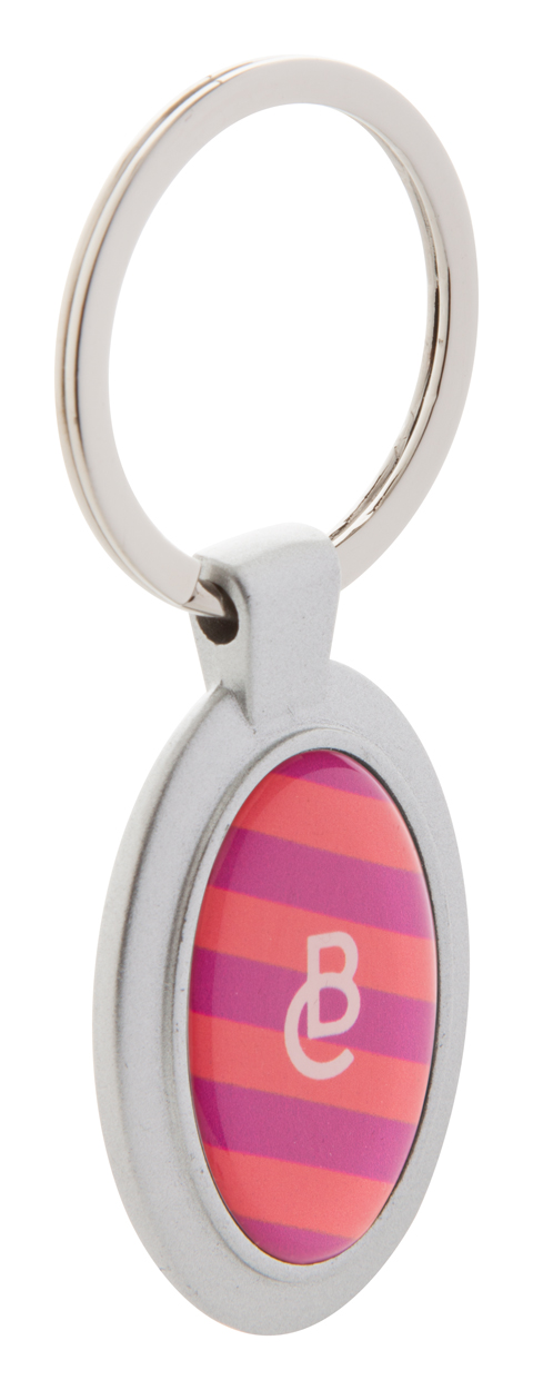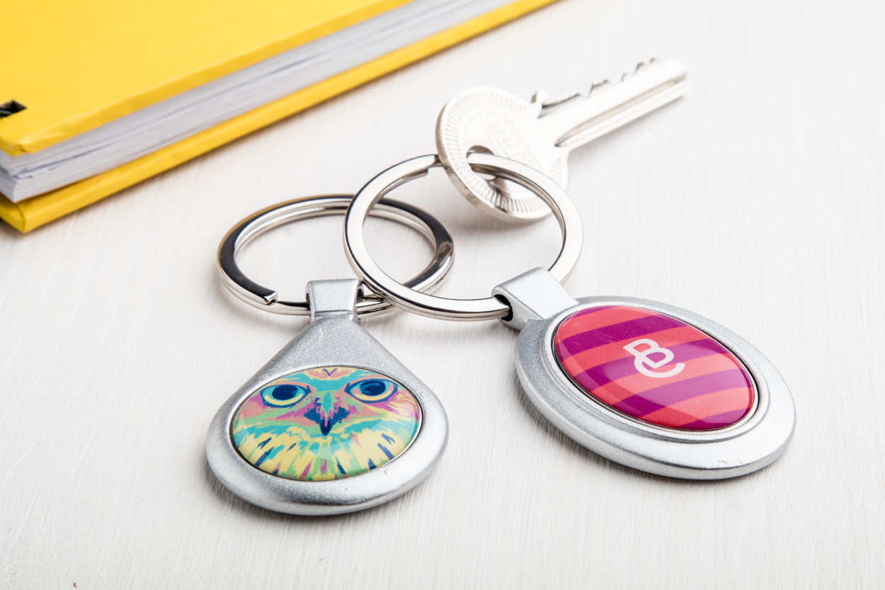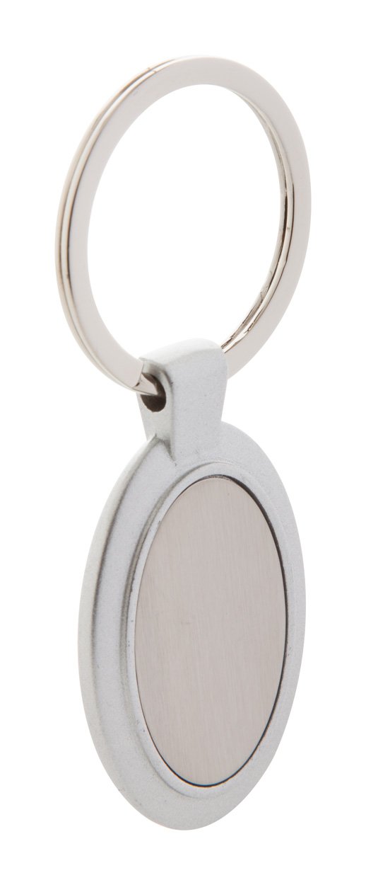 Hliníkový přívěšek na klíče ve tvaru oválu, s kovovým kroužkem.